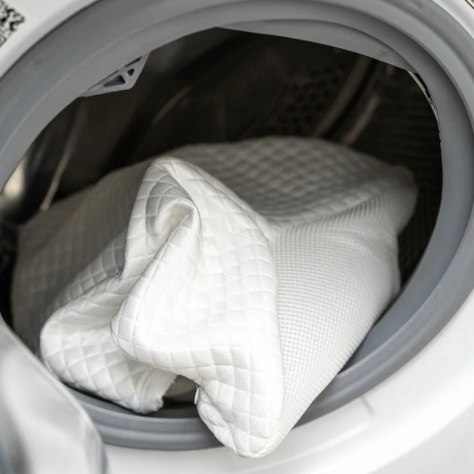 Poduszka posiada zdejmowaną poszewkę, którą można prać w pralce. Wystarczy zdjąć poszewkę i wyprać ją w zimnej wodzie na delikatnym cyklu, a następnie wysuszyć w suszarce w niskiej temperaturze.